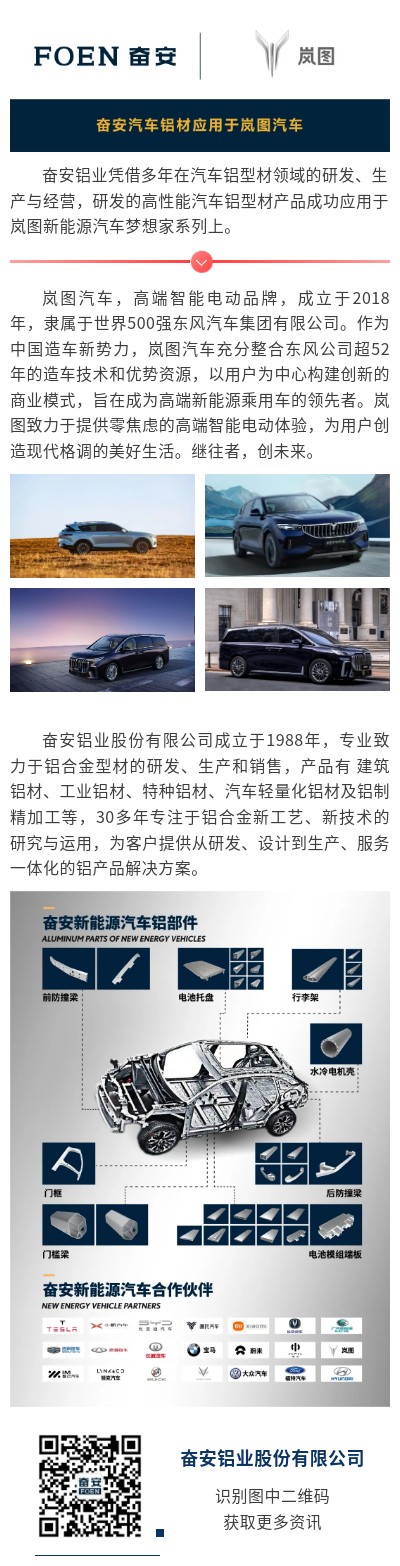 【產(chǎn)品應(yīng)用案例】奮安汽車(chē)鋁部件應(yīng)用于嵐圖新能源汽車(chē)