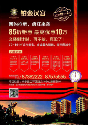 為了回饋廣大客戶,在這感恩佳節(jié),鉑金漢宮特推出團(tuán)購搶房,瘋狂來襲活動(dòng),特推出六重鉅惠。