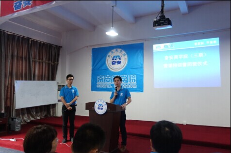 7月8日上午,當(dāng)?shù)谝豢|輕柔的陽光灑向大地,本次歷時(shí)六天的奮安商學(xué)院第三期暨營銷特訓(xùn)營如期開展。奮安商學(xué)院執(zhí)行院長黃秀華女士的開營演講給人啟發(fā)是良多的,她說,她是亮麗的,人走到哪里都要照亮別人。豹子的項(xiàng)鏈象征豹子的精神,虎的戒指代表虎的干勁,愛心手表時(shí)刻提醒自己做人要懂得感恩。幸福、家、責(zé)任、堅(jiān)強(qiáng)、堅(jiān)持,五個(gè)簡單的詞匯卻將難能可貴的“做幸福的奮安人”的精神展現(xiàn)給新一批的學(xué)員們。