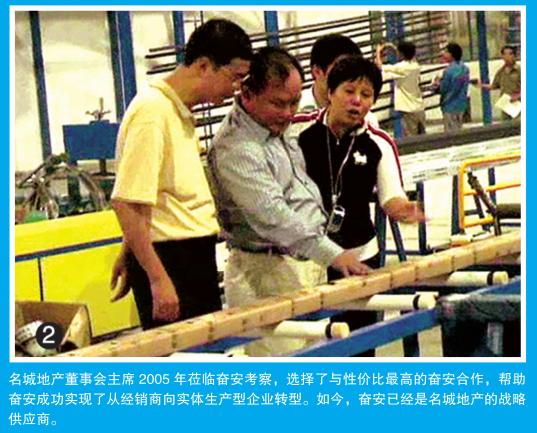 (名城地產董事會主席2005年蒞臨奮安考察,選擇了與性價比最高的奮安合作,幫助奮安成功實現了從經銷商向實體生產型企業轉型。如今,奮安已是名城地產的戰略供應商。)