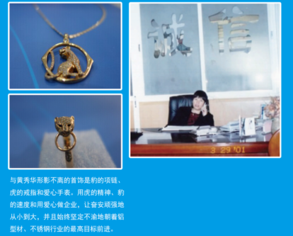 (與黃秀華形影不離的首飾是豹的項鏈、虎的戒指和愛心手表。用虎的精神、豹的速度和用愛心做企業,讓奮安頑強地從小到大,并且始終堅定不渝地朝著鋁型材、不銹鋼行業的最高目標前進。)