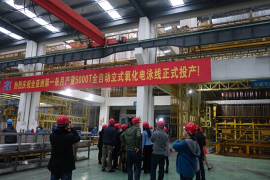 我司營銷總監(jiān)黃磊和生產副總歐開干正為貴賓介紹我司全亞洲第一條月產量5000T自動立式氧化電泳生產線