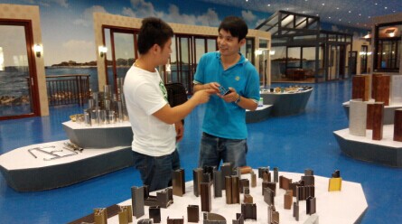 (我司銷售部人員在全國最大的門窗體驗中心向貴賓介紹我司新表面處理工藝)