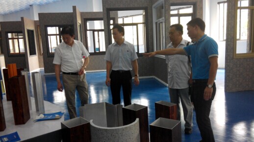(鄒副總在全國最大的門窗體驗中心向貴賓介紹奮安特色鋁單板、鋁模板)
