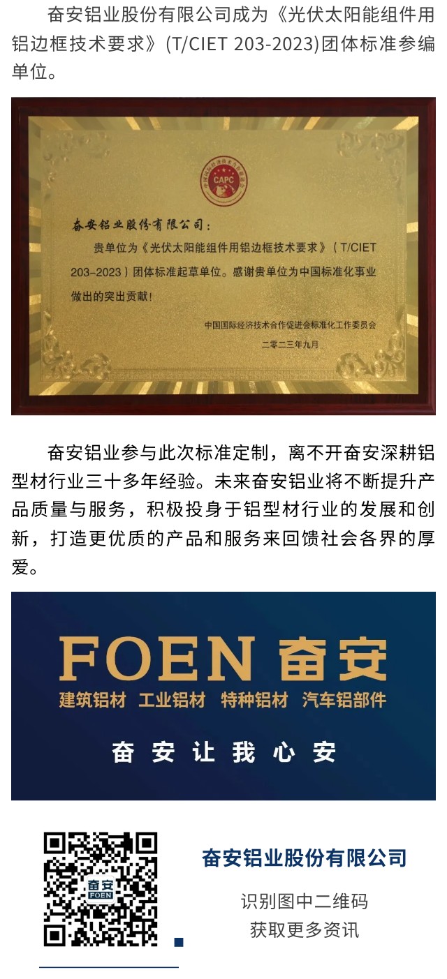 喜報|奮安鋁業股份有限公司成為《光伏太陽能組件用鋁邊框技術要求》(T/CIET 203-2023)團體標準參編單位