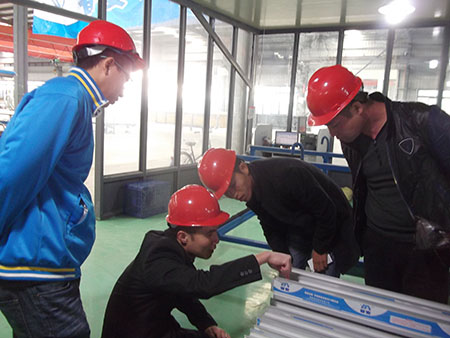 貴賓依次參觀我司型材生產(chǎn)的每一個車間,仔細(xì)考察每一道生產(chǎn)工序。尤其是在深加工車間,貴賓對注膠隔熱斷橋型材特別關(guān)注,我司型材加工成的門窗和幕墻產(chǎn)品具有良好的氣密性、防水性和隔音、節(jié)能等效果。