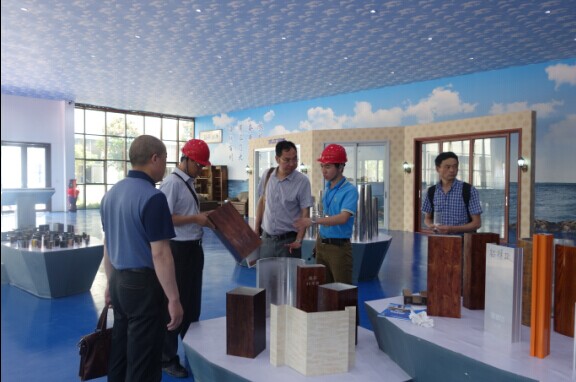 鄭副總在全國最大的門窗體驗中心向貴賓介紹奮安特色鋁單板、鋁模板