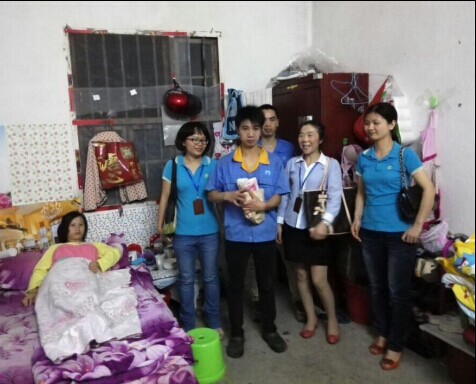 工會主席陳凌芹攜噴涂車間副主任李毅、行政主管陳學碧、人資主管李慧英將善款送至周龍本人手中