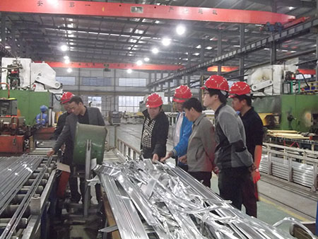 貴賓依次參觀我司型材生產的各個車間。我司型材生產全部采用優質原材料,保證了成品鋁材的卓越品質。此外還擁有多條立式噴涂線、立式氧化電泳線、自動包裝線、自動輸送線等一系列先進的生產設備。設備先進,品質卓越。